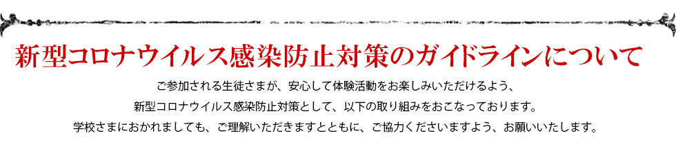 体験活動実施時、生徒さまは健康である事を前提に受入をおこなっております。少しでも体調の悪い、または発熱がある生徒さまにつきましては、決して参加させないよう、生徒さまの健康管理については細心の注意を払っていただくようお願いいたします。